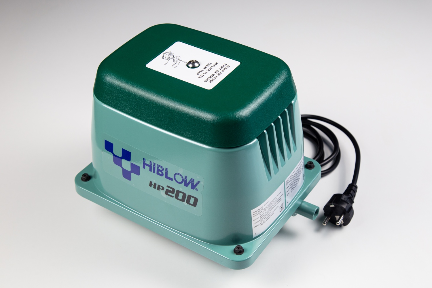 Компрессор (воздушный насос) HIBLOW HP-200 производительностью от 200 л/мин при давлении 200 мбар (20 кПа).